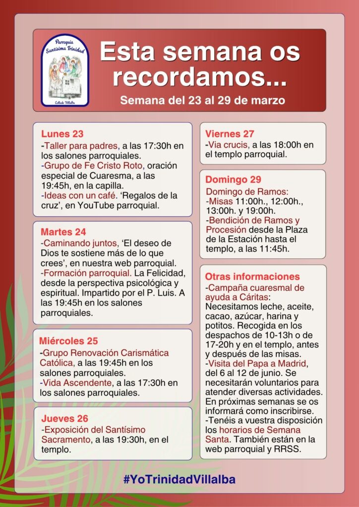 Por cuaresma iniciamos la campaña de ayuda a Cáritas: Necesitamos Leche, aceite, cacao, azúcar, harina y potitos. Tenéis en la mesita del fondo la lista de los artículos para traer, en los despachos de 10-13h. o de 17-20h. En el templo, durante las misas.