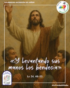 Jesús, después de haber compartido la vida con los suyos, los conduce hasta el lugar de la bendición. Con ternura infinita, abre ante ellos un horizonte nuevo donde su presencia se hace más profunda y cercana, habitando en lo íntimo de cada corazón. Bendiciéndolos, los envía a ser testigos de la misericordia y de la vida nueva que brota de la Pascua. En ese gesto de sus manos extendidas resplandece la promesa del Espíritu, que colmará sus vidas de fuerza y de alegría, llenando cada rincón de su existencia.