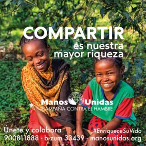 Manos Unidas es la Organización No Gubernamental de la Iglesia católica en España para el desarrollo de los países y pueblos más empobrecidos de la tierra. En esta campaña, con el lema «Compartir es nuestra mayor riqueza», queremos primero hacer llegar a la sociedad española nuestro profundo agradecimiento por su solidaridad que está permitiendo mejorar las condiciones de vida de millones de seres humanos en el Sur. Pero como desgraciadamente muchos desafíos siguen pendientes, queremos seguir planteando la necesidad de que «la riqueza mundial» se ponga al servicio de la humanidad, para así erradicar definitivamente la pobreza, el hambre y la desigualdad de nuestro planeta.
