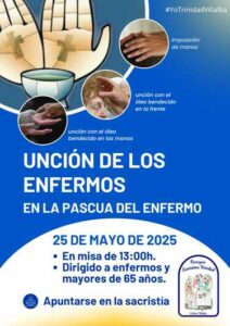 Este 25 de mayo, en la celebración de la Pascua del Enfermo, nuestra Parroquia Santísima Trinidad de Collado Villalba se llenará de gracia y ternura al acoger la celebración comunitaria del Sacramento de la Unción, durante la Misa de las 13:00h. Está especialmente dirigida a enfermos y personas mayores de 65 años, pero es una invitación que nos alcanza a todos: familiares, amigos, voluntarios, feligreses, jóvenes… Porque este no es solo un momento litúrgico: es una oportunidad para redescubrir la profundidad de nuestra fe y el poder del amor que acompaña.